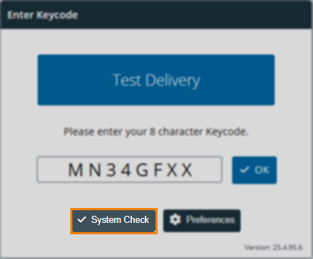 Select System Check in the Enter Keycode screen to open the System Check dialog.