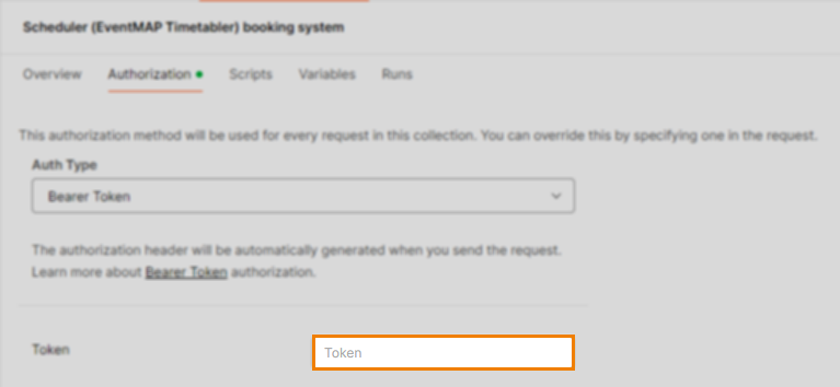 If using the ‘Scheduling System’ Postman collection, include your token in the Token field in Authorization: