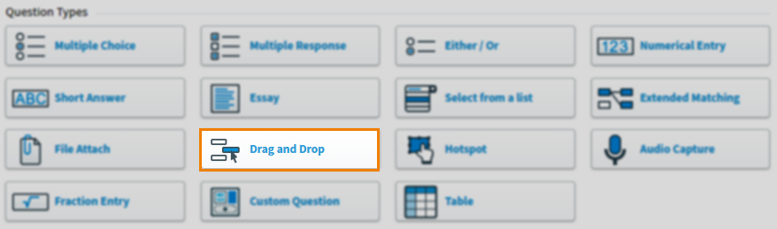 In your subject, select Create New Item to open the Question Types menu. Choose Drag and Drop to create a blank Drag and Drop item and go to the Edit screen.