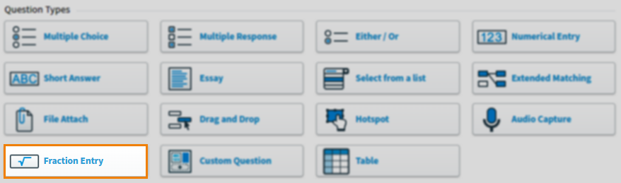 In your subject, select Create New Item to open the Question Types menu. Choose Fraction Entry to create a blank Fraction Entry item and go to the Edit screen.
