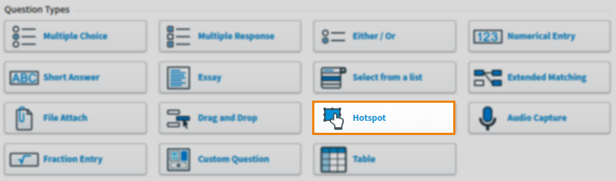 In your subject, select Create New Item to open the Question Types menu. Choose Hotspot to create a blank Hotspot item and go to the Edit screen.