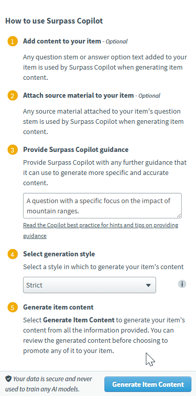 TIP: To generate new content, select Refine Instructions to return to the first step of the Surpass Copilot dialog and amend the guidance you provided – along with any amends to your item’s content and source material – before selecting Generate Item Content again. This lets you prompt Copilot multiple times to iteratively build your item.