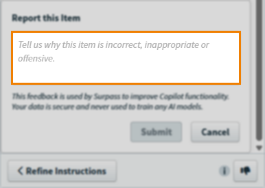 You can report incorrect, inappropriate, or offensive items generated by Surpass Copilot. Reporting inappropriate content generated by Copilot is encouraged as it helps us refine Copilot’s output.
