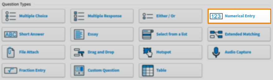 In your subject, select Create New Item to open the Question Types menu. Choose Numerical Entry to create a blank Numerical Entry item and go to the Edit screen.
