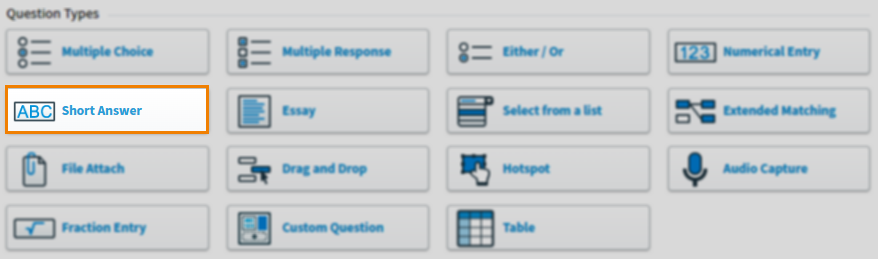 In your subject, select Create New Item to open the Question Types menu. Choose Short Answer to create a blank Short Answer item and go to the Edit screen.