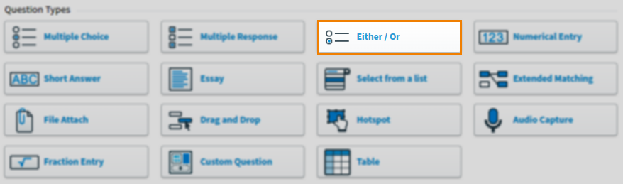 In your subject, select Create New Item to open the Question Types menu. Choose Either/Or to create a blank Either/Or item and go to the Edit screen.