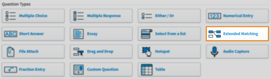 In your subject, select Create New Item to open the Question Types menu. Choose Extended Matching to create a blank Extended Matching item and go to the Edit screen.