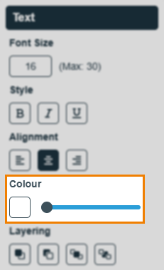 Change the colour of text using the Colour buttons. Use the slider tool to change the transparency of the colour. Colour properties are available for Text.