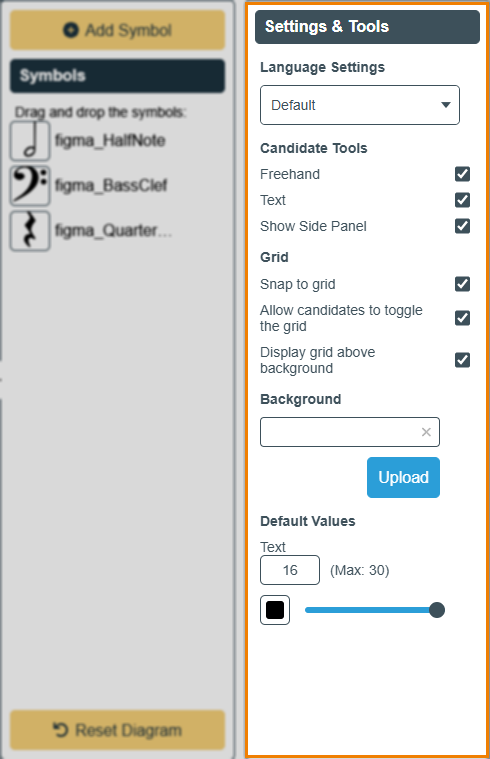 The Custom Drag and Drop custom question type lets you create and edit a diagram on a canvas. Candidates can upload (or use pre-uploaded) symbols and add lines and text.