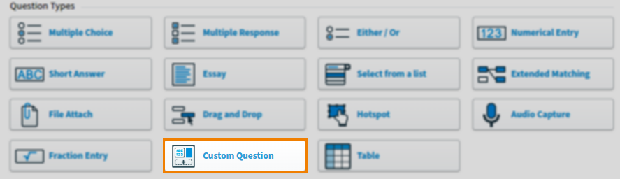 In your subject, select Create New Item to open the Question Types menu. Choose Custom Question to create a blank Custom Question item and go to the Edit screen.