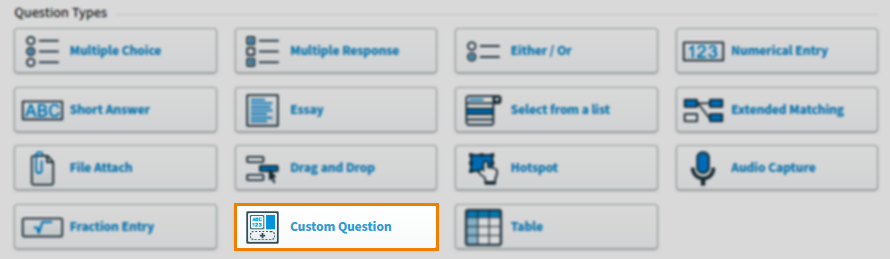 In your subject, select Create New Item to open the Question Types menu. Choose Custom Question to create a blank Custom Question item and go to the Edit screen.