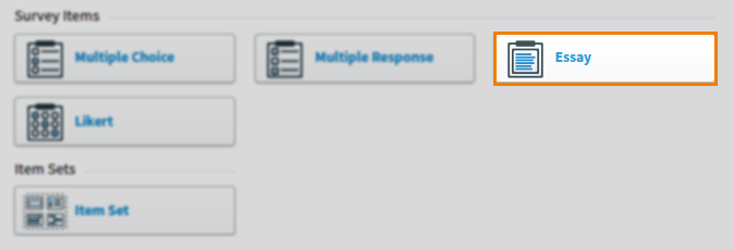 In your subject, select Create New Item to open the Survey Items menu. Choose Essay to create a blank Essay survey item and go to the Edit screen.