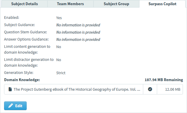 The Surpass Copilot panel is where you can assign default guidance for item authors generating multiple choice questions using Surpass Copilot. For more information, go to Surpass Copilot.