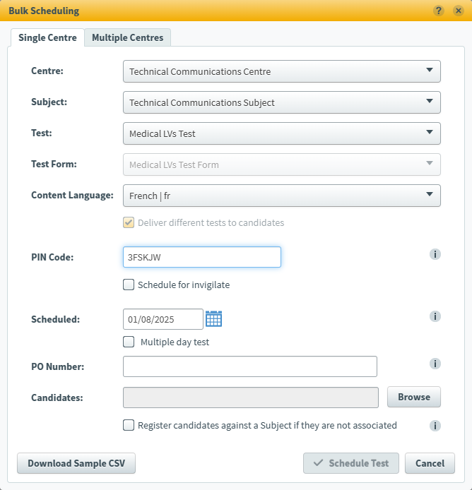 There are two Bulk Schedule modes. Single Centre allows you to schedule up to 1,000 candidates for a single test at one centre. Multiple Centres allows you to schedule up to 3,000 candidates for multiple tests across multiple centres.