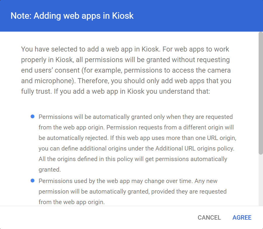 Read the Adding web apps in Kiosk terms and then select AGREE.