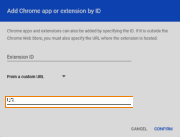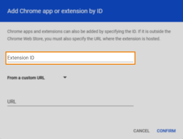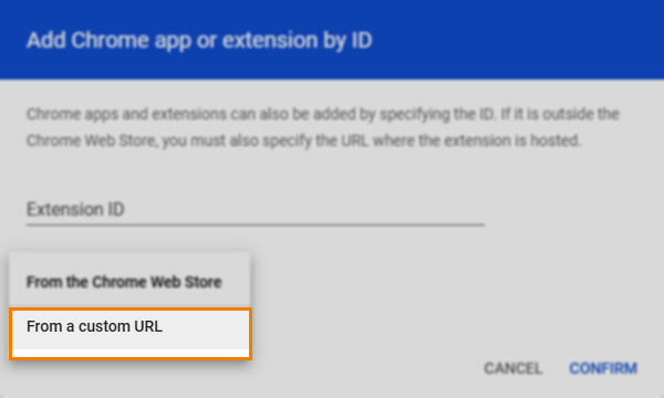 In the Add Chrome app or extension by ID window, select From the Chrome Web Store and choose From a custom URL.