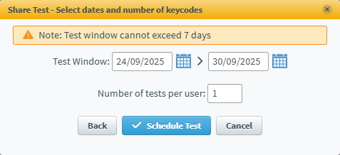 You can define your test schedule availability window in the Share Test – Select dates and number of keycodes dialog. You can also define how many keycodes are generated for each user.
