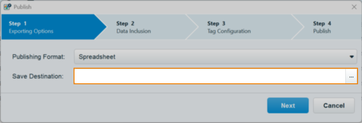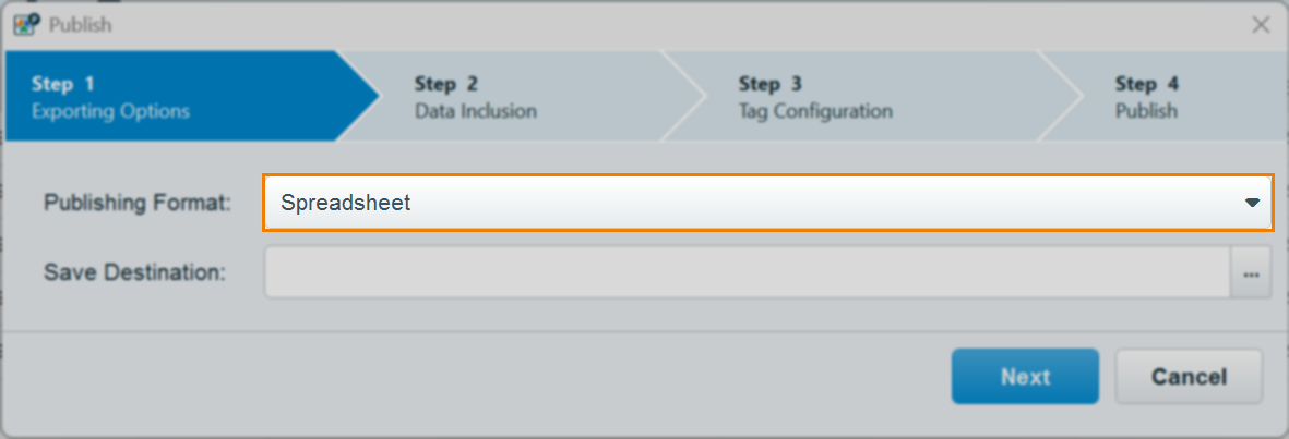In the first step of the Publish wizard, Exporting Options, select Spreadsheet from the Publishing Format drop-down menu.