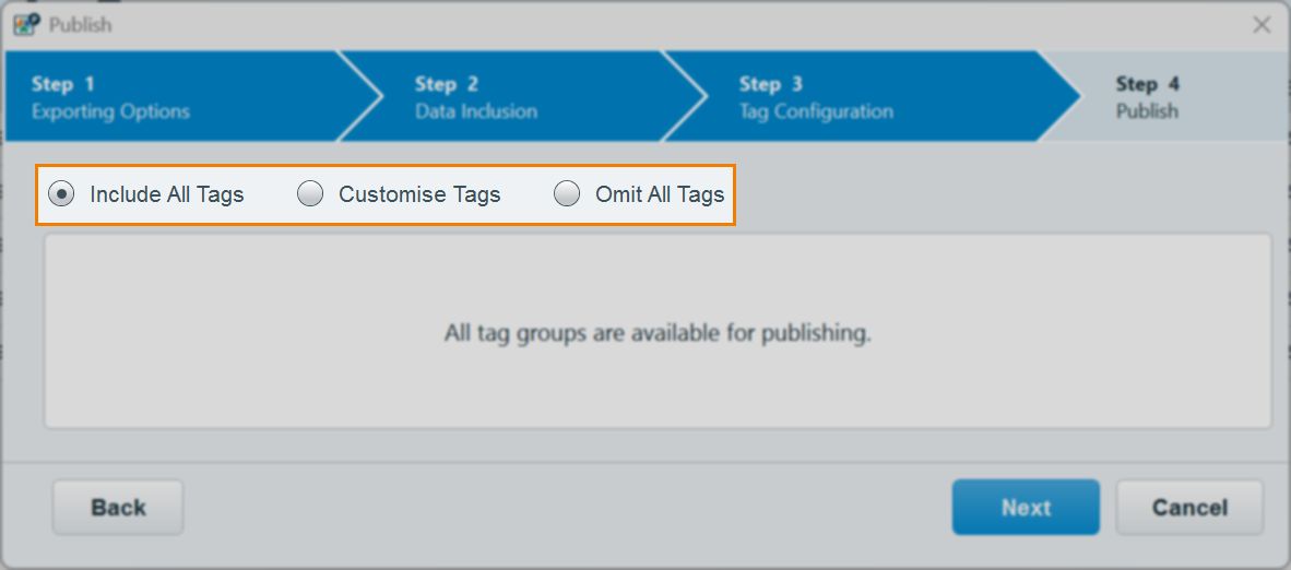 In Step 3 – Tag Configuration, choose between including all tags (Include all tags), a subset of tags (Customise tags), or no tags (Omit all tags) in your spreadsheet. The available tag groups are the tag groups in the subject(s) of the items in the item list.