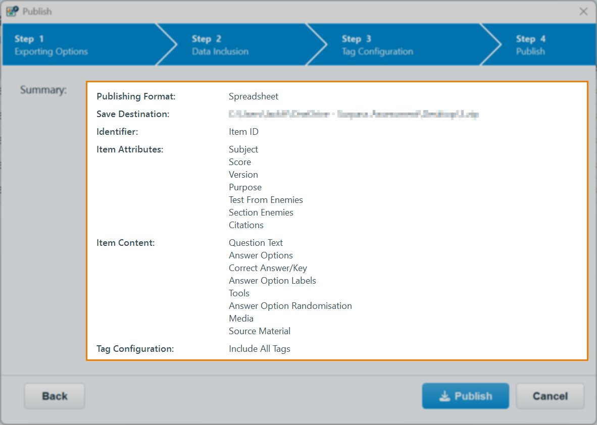 Select Publish to publish your items. Your items are published in a ZIP file in your specified Save destination.