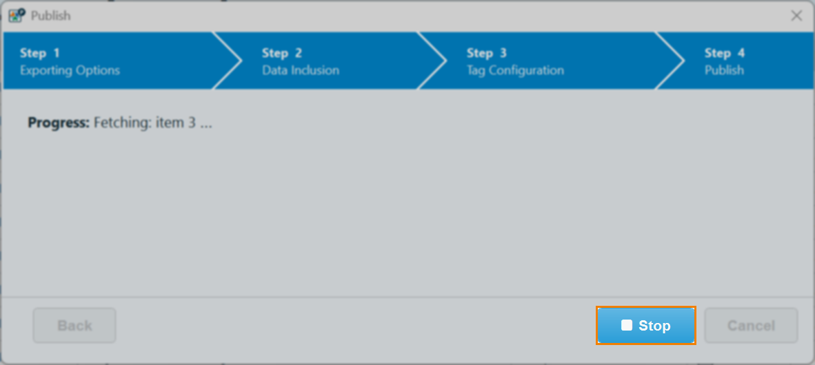 Once Publish has been selected, you can view the progress of the publishing process within the wizard. You can also choose to Stop publishing if required.