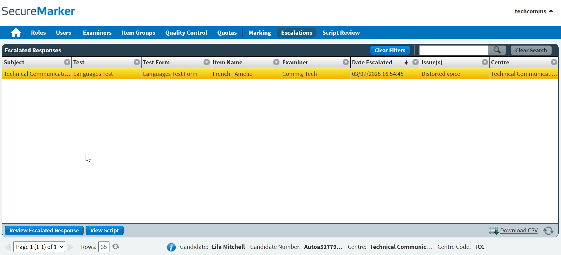 Choose an escalated response in the Escalated Responses grid to view details about the centre and candidate. Details include: