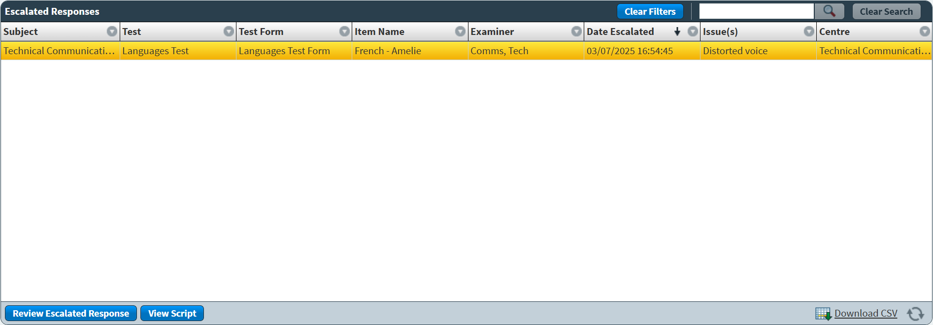 Select Download CSV to export the Escalated Responses data to a spreadsheet.
