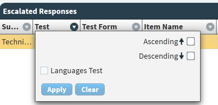 By default, the Escalated Responses grid is ordered by the most recently escalated responses. Select the expander () on a column header to open a filter menu. Columns with filters applied are indicated by the filter icon: .