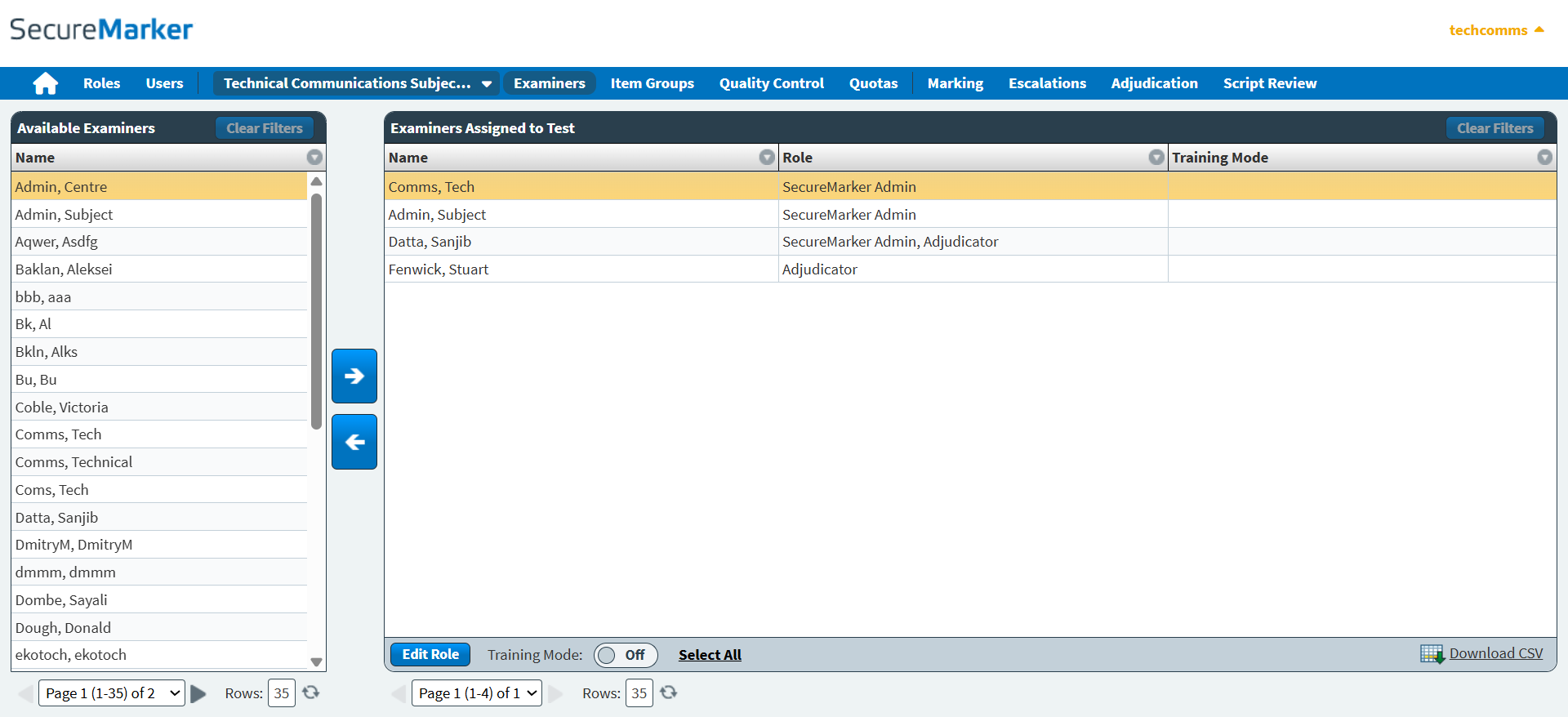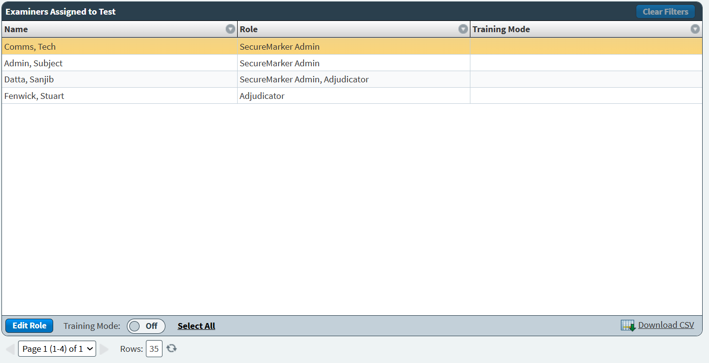 Select Download CSV to download the Examiners Assigned to Test grid data to a spreadsheet.