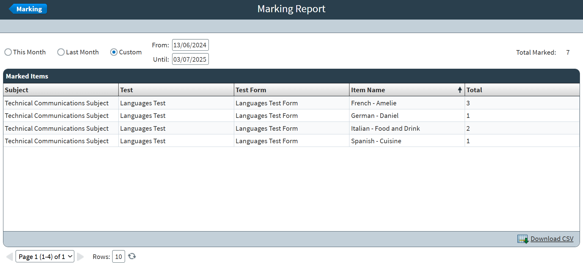 You can view a report of your marked candidate responses in the Marking screen. This report includes details on the number of candidate responses you have marked for an item or item group.