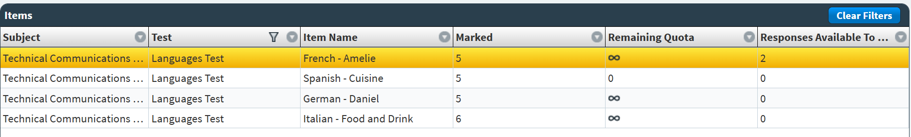 You can view the number of responses you have marked and the number of responses left to mark in your quota. A hyphen (-) indicates an unlimited quota. For more information, read Setting quotas for examiners in SecureMarker.