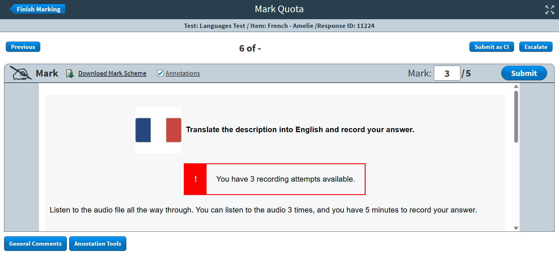 You can view responses, assign marks, and download mark schemes in the Mark Quota screen. You can also submit responses as control items and escalate responses for further attention. For more information, read Submitting a response as a control item in the Marking screen and Escalating a response in the Marking screen.