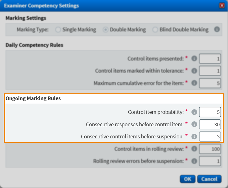 | Consecutive control items before suspension | Defines the maximum consecutive number of control items that an examiner can mark out of tolerance before they are suspended from marking. |