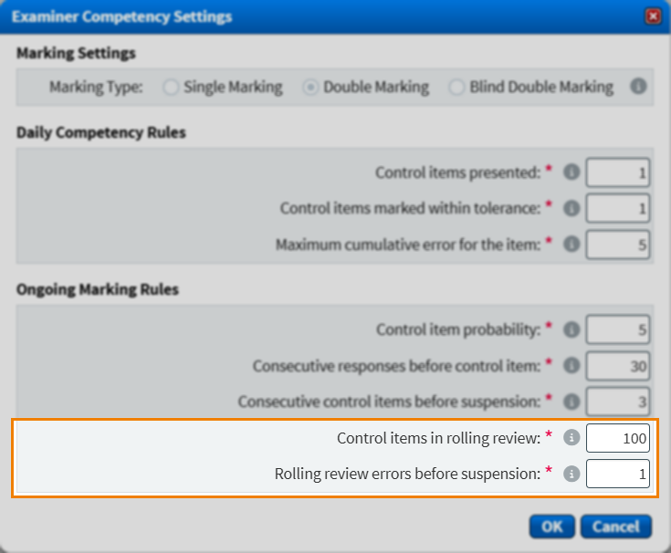As part of the ongoing marking rules, you can set up a rolling review. This allows you to review examiner performance historically on control items to ensure the quality of marking is as consistent as possible.