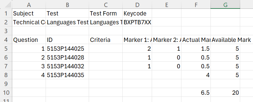 The export spreadsheet contains information about the selected script, including the name of the test, the candidate’s unique alphanumeric keycode, and the mark assigned to each response in the script.