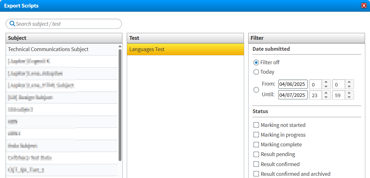 In the Subject and Test panels of the Export Scripts wizard, choose the subject and test that contain the scripts you want to confirm to Surpass. You can find a specific subject and test in the Search subject/test search bar.