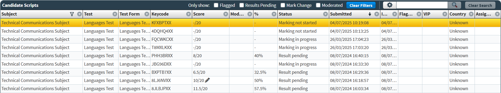All scripts in SecureMarker can be viewed and managed in the Script Review screen. You can review and moderate scripts, export scripts to a spreadsheet, and send completed scripts with pending results from SecureMarker to Surpass.