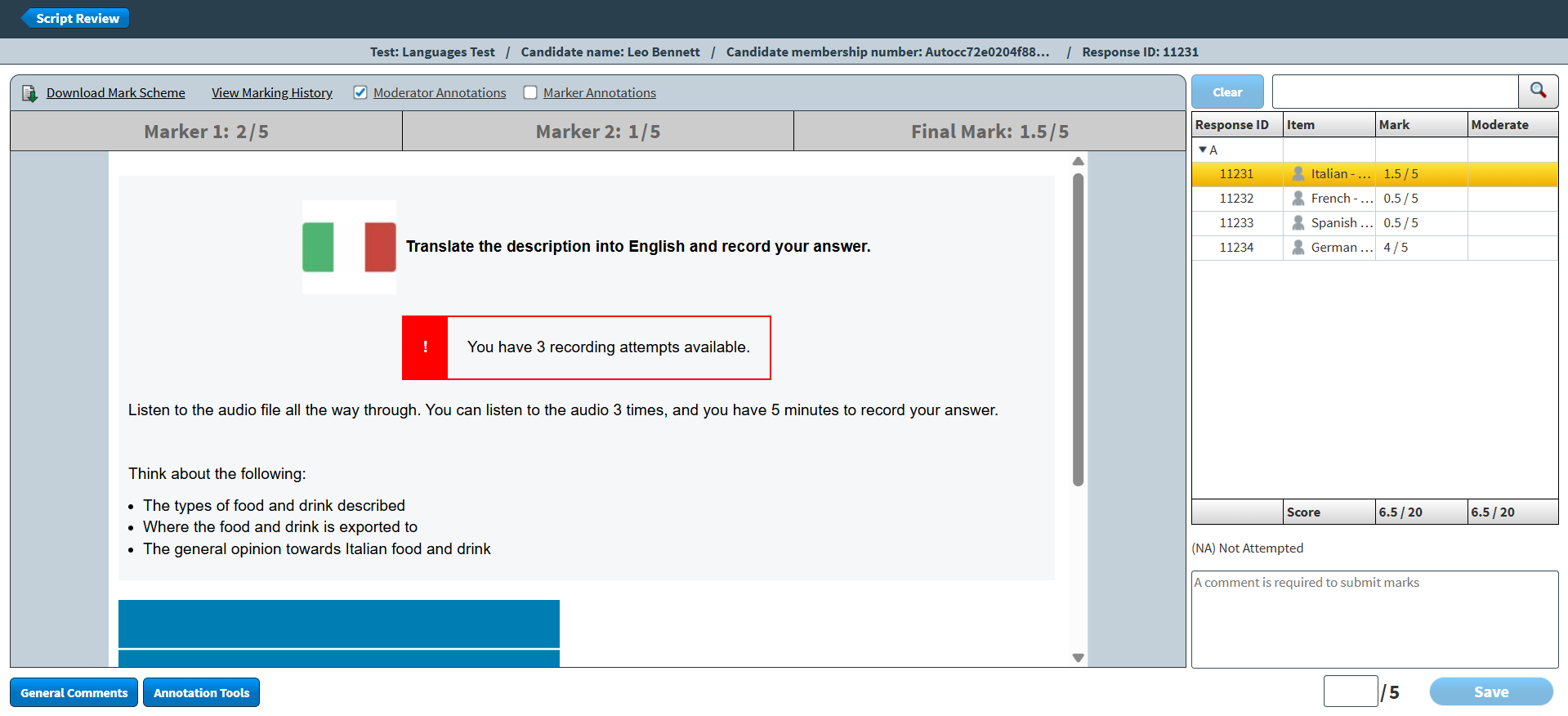 This article explains how to moderate a script in the Script Review screen, including how to change marks.